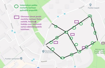 Vartiokylänlahden varustaminen penkeillä, penkkien etäisyys toisistaan 500 m ja sijoittelu mahdollisesti merinäköala huomioiden (liite1). Puotilan venesataman varustaminen penkeillä sekä tarvittavalla valaistuksella, penkkien ja valaistuksen etäisyys 100 m (liite2). Juorumäen varustaminen valaistuksella, valaistuksen etäisyys toisistaan 50m (liite3). Valaistuksessa huomioidaan lepakoiden elinolosuhteet - asiasta konsultoitu kaupunkiympäristön toimialan asiantuntijaa. Kaikkiin penkkeihin mm. ikäihmisiä ja pieniä lapsia varten korkeampi selkänoja ja käsinojat, jotta penkeiltä on helpompi nousta ylös sekä mahdollisuuksien mukaan penkit myös näköetäisyydellä toisistaan.