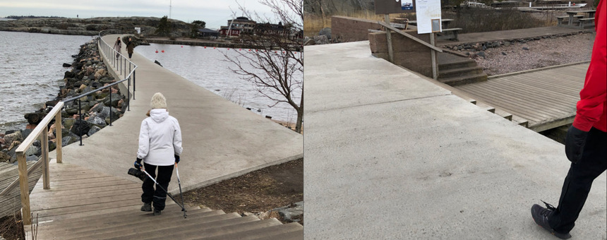6. Tehdään esteettömäksi kävelyreitti saarten välillä olevan aallonmurtajan kummastakin päästä poistamalla portaat ja maan rosoinen pinta. Niin saadaan esteetön kulku lastenrattaita ja rollaattoreita käyttäville. Tasoitetaan sopivin keinoin Liuskasaaren palveluihin johtava polku.