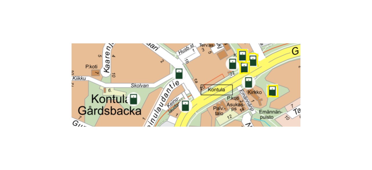 Karttakuva Kontulan nykyisistä ja tulevista keräysastioista. Sijainnit suunniteltu yhdessä päihdealan asiantuntijoiden kanssa. (jpg, 74.53 KB)